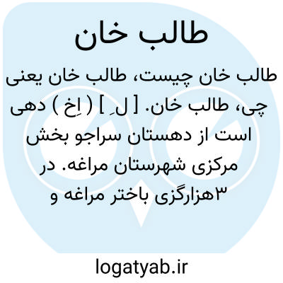 طالب خان. [ ل ِ ] ( اِخ ) دهی است از دهستان سراجو بخش مرکزی شهرستان مراغه. در 3هزارگزی باختر مراغه و دوهزارگزی شمال باختری شوسه مراغه به آذرشهر. جلگه معتدل با 438 تن سکنه شیعه. آب آن از صوفی چای و محصول آنجا غلات و کشمش و نخود و بادام و زردآلو. شغل اهالی زراعت، صنایع دستی، گلیم بافی و راه آن ارابه رو است. ( از فرهنگ جغرافیایی ایران ج 4 ).