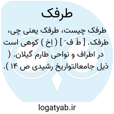 طرفک. [ طَ ف َ ] ( اِخ ) کوهی است در اطراف و نواحی طارم گیلان. ( ذیل جامعالتواریخ رشیدی ص 14 ).