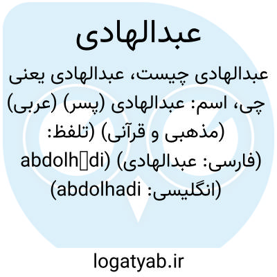 معنی: بنده پروردگار هدایت کننده و راهنما، بنده ی خدای هدایت کننده، بنده ی خدای راهنما، ( اَعلام ) ) حاج ملاهادی بن مهدی، حکیم سبزواری [، قمری] از مشاهیر فلاسفه و حکما و متألهین اسلامی اواخر قرن سیزدهم، اهل سبزوار، دانش آموخته ی مشهد و اصفهان معروف به حاجی ملا و حاجی سبزواری و در شعر متخلص به اسرار، وی با سادگی و زهد تمام می زیست و به ملوک و امرا اعتنایی نداشت و هنگامی که ناصرالدین شاه در سبزوار به خانه ی او رفت او را بر همان حصیری که خود و دیگران می نشستند نشانید، حالات و کرامات بسیار به او نسبت داده اند، از آثار اوست: اسرارالحکم، اسرارالعبادة، الجَبر والاختیار، شرح الاسماء الحسنی، غرَر الفوائد، الّلاَلی المنتظمة، النّبِراس، ) عبدالهادی بن عبدالله عبدالهادی سِجِلماسی [ میلادی] محدث مراکشی، ساکن شهر فارس، از آثار اوست: شرح تَیسیر الوصول الی جامع الأصول، از ابن دَیبع شیبانی، ) عبدالهادی بن عبدالله بن علی ابومحمد [ میلادی] ادیب و محدث فاضل مراکشی، دانش آموخته ی فاس، متوفی در مکه یا مدینه از آثار اوست: منظومة لامیّة فی مصطَلَح الحدیث، فلک السعادة فی فصل الجهاد و الشهادة، ) عبدالهادی شَلیلَه [، قمری] فقیه اصولی امامی و محدث رجالی، از آل شلیله، متولد در نجف، متوفی در همدان، مدفون در نجف، بیست کتاب دارد از جمله: منتقی الشیعة فی احکام الشّریعة، منتهی المیزان، غایة المأمول فی الفقه والاصول، ) عبدالهادی بن اسماعیل شیرازی [، قمری] فقیه امامی، ادیب و شاعر، اهل نجف، از آثار اوست: وَسیلة النجاة، توضیح المسائل، حاشیة عروة الوثقی، ) عبدالهادی بن ابراهیم، جمال الدین الوزیر صَنعانی [ میلادی] ادیب و مورخ زیدی یمنی، از آثار اوست: طراز العَلَمین فی فضائل الحَرَمین المحترمَین، کفایة القانع فی معرفة الصّانع، هدایة الرّاغِبین الی مذهب اهل البَیت الطاهرین