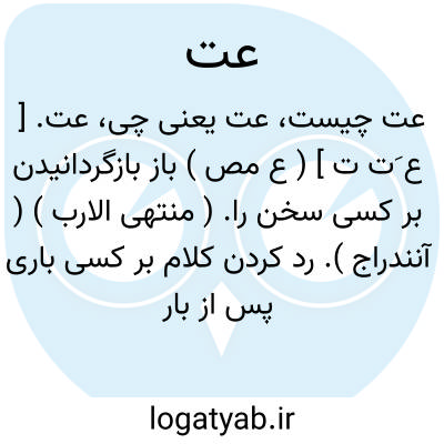 عت. [ ع َت ت ] ( ع مص ) باز بازگردانیدن بر کسی سخن را. ( منتهی الارب ) ( آنندراج ). رد کردن کلام بر کسی باری پس از بار دیگر. ( اقرب الموارد ). || ستیهیدن بر کسی در سؤال. ( منتهی الارب ) ( آنندراج ) ( اقرب الموارد ).