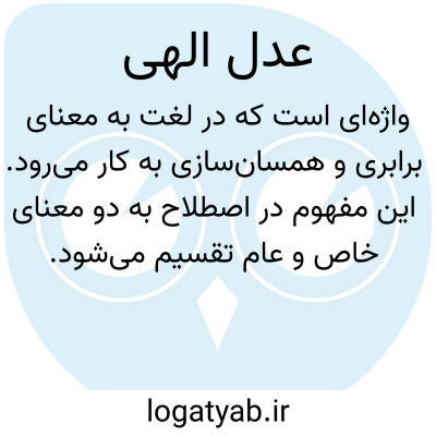 واژه‌ای است که در لغت به معنای برابری و همسان‌سازی به کار می‌رود. این مفهوم در اصطلاح به دو معنای خاص و عام تقسیم می‌شود. در معنای خاص، عدل به مفهوم رعایت حقوق صاحبان حق و اعطاء هر چیزی به ذی‌حق آن است، یعنی «اعطاء کلِّ ذی حَقٍّ حَقَّهُ». در معنای عام، عدل به معنای نهادن هر چیز در جای خود یا انجام هر کاری به بهترین وجه ممکن است، یعنی «وضعُ کلِّ شَی ءٍ فی موضِعِه». در کاربرد اخیر، عدل با حکمت نزدیک و گاه مترادف در نظر گرفته می‌شود، حال آنکه در کاربرد نخست، تنها بخشی از عدالت را شامل می‌شود. بنابراین، عدالت الهی به معنای برابر قرار دادن همه انسان‌ها یا همه اشیاء نیست و نباید با مفهوم مساوات خلط شود. مقتضای عدل الهی آن است که هر فردی متناسب با استعداد و ظرفیت خود مورد تکلیف قرار گیرد و سپس، با توجه به تلاش و اختیار او، داوری و در نهایت، پاداش یا کیفر شایسته دریافت کند.