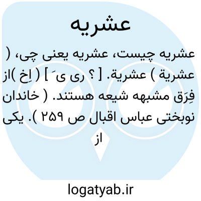 ( عشریة ) عشریة. [ ؟ ری ی َ ] ( اِخ )از فِرَق مشبهه شیعه هستند. ( خاندان نوبختی عباس اقبال ص 259 ). یکی از پنج فرقه اصحاب حدیث باشند. ( بیان الادیان ). و رجوع به خطط مقریزی ج 4 ص 170 شود.