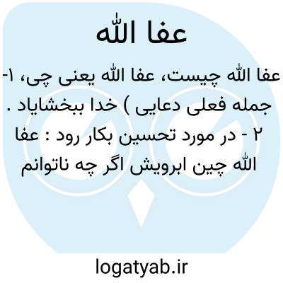 ۱- جمله فعلی دعایی ) خدا ببخشایاد. ۲ - در مورد تحسین بکار رود: عفا الله چین ابرویش اگر چه ناتوانم کرد بعشوه هم پیامی بر سر بیمار می آورد. ( حافظ ) توضیح گاه با از و ز آید هم عفا الله زصبا کز تو پیام میداد ورنه در کس نرسیریم که از کوی تو بود. ( حافظ ) یا ای عفا الله. قس. پدر بیامرز: معنی دعوت بسی بنموده ما را در حضور ای عفا الله دعوی دعوات در غیبت چرا ? ( سنائی ) یا عفا الله عنک. ۱ - خدا از گناهانت در گذرد. ۲ - خدا ترا اصلاح کند و عزیز گرداند. یا عفا الله عنه. خدا از او ( مذکر ) در گذرد. خدا گناهان او را ببخشایاد. یا عفا الله عنها. خدا از او در گذرد: دواعی انتقام....باعث و محرض آمد بر آنک مواد فساد ملک ناصرالدین قباجه - عفا الله عنها - بکلی قطع کند.