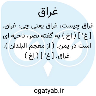 لغت نامه دهخدا غراق. [ غ ُ ] ( اِخ ) به گفته نصر، ناحیه ای است در یمن. ( از معجم البلدان ).غراق. [ غ ُ ] ( اِخ ) نام شهری به ترکستان.