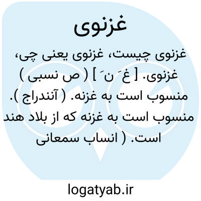 غزنوی. [ غ َ ن َ ] ( ص نسبی ) منسوب است به غزنه. ( آنندراج ). منسوب است به غزنه که از بلاد هند است. ( انساب سمعانی ). منسوب به غزنین و غزنی. رجوع به غزنین شود.