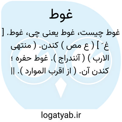 غوط. [ غ َ ] ( ع مص ) کندن. ( منتهی الارب ) ( آنندراج ). غوط حفره؛ کندن آن. ( از اقرب الموارد ). || درآمدن چیزی در چیزی. ( منتهی الارب ). داخل شدن. فرورفتن.یقال: هذا رمل تغوط فیه الاقدام. غَیط. || غوط انساع دابه؛ چسبیدن دوال و تنگ چارپا به شکم وی و فرورفتن در آن. غاط انساع الدابه؛ لزقت ببطنها قدخلت فیه. || غایب و ناپدید شدن و دور گردیدن. غاط الرجل فی الوادی؛ مرد در بیابان ناپدید شد.( از اقرب الموارد ). فرودآمدن به زمین نشیب. ( المصادر زوزنی ). || فرورفتن در آب. انغماس. ( از اقرب الموارد ). || خالی شدن شکم از مدفوع.( دزی ج 2 ص 231 ). || ( اِ ) ثرید. ( مهذب الاسماء ) ( منتهی الارب ) ( آنندراج ). ثریدة. ( اقرب الموارد ).نان پاره های ترشده در آبگوشت و شوربا. رجوع به ثرید و ثریده شود. || زمین پست فراخ. ( منتهی الارب ) ( آنندراج ). غوط و غاط بمعنی زمین پست و پهناور. ج، غوط، اَغواط، غیطان، غِیاط. ( از اقرب الموارد ).