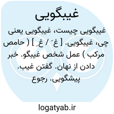 غیبگویی. [ غ َ / غ ِ ] ( حامص مرکب ) عمل شخص غیبگو. خبر دادن از نهان. گفتن غیب. پیشگویی. رجوع به غَیب و غیبگو شود.