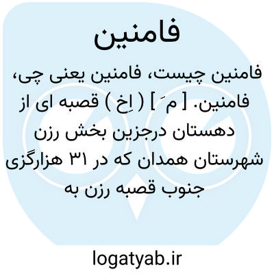 فامنین. [ م َ ] ( اِخ ) قصبه ای از دهستان درجزین بخش رزن شهرستان همدان که در 31 هزارگزی جنوب قصبه رزن به همدان واقع است. جلگه ای سردسیر، مالاریائی و دارای 4170 تن سکنه است. آب آنجا از قنات تأمین میشود و محصول عمده اش غلات، حبوبات، صیفی، لبنیات، و شغل اهالی زراعت و گله داری و صنعت دستی زنان قالی بافی است. دارای 50 دکان و یک دبستان است. راه فرعی شوسه دارد. ( از فرهنگ جغرافیایی ایران ج 5 ).