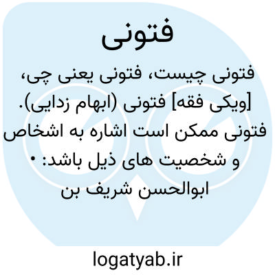 [ویکی فقه] فتونی (ابهام زدایی). فتونی ممکن است اشاره به اشخاص و شخصیت های ذیل باشد: • ابوالحسن شریف بن محمدطاهر فتونی نباطی عاملی، یکی از علما و مفسرین بزرگ قرن دوازدهم و از افاضل تلامذه علامه مجلسی• محمدمهدی فتونی کبیر، از نواده های ابوالحسن شریف فتونی عاملی و از علمای قرن سیزدهم هجری قمری