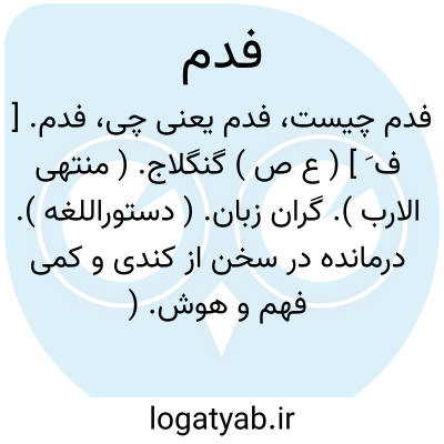 فدم. [ ف َ ] ( ع ص ) گنگلاج. ( منتهی الارب ). گران زبان. ( دستوراللغه ). درمانده در سخن از کندی و کمی فهم و هوش. ( از اقرب الموارد ). بعیدالفطنة. ( اقرب الموارد از مصباح ). || مرد گول درشت بدخوی. ( منتهی الارب ). مرد درشتخوی احمق. ( اقرب الموارد ). ج، فِدام. ( منتهی الارب ) ( اقرب الموارد ). || سرخ سیررنگ.( منتهی الارب ). سرخ سیررنگ. آنچه سرخی آن شدید نباشد. || خبز فدم؛ نان سفت. ( اقرب الموارد ).