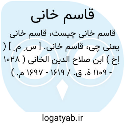 قاسم خانی. [ س ِ م ِ ] ( اِخ ) ابن صلاح الدین الخانی ( 1028 - 1109 هَ. ق. / 1619 - 1697 م. ) یکی از دانشمندان متصوف و از مردم حلب است. وی به عراق و حجاز و ترکیه سفر کرد و به حلب برگشت و تا هنگام مرگ متصدی منصب افتاء بود. تألیفاتی دارد و از اوست: 1- السیر والسلوک الی ملک الملوک، چاپی. 2- تصوف. 3- شرح علی الجزریه، در تجوید. 4- رسالة فی المنطق. کتابهای اخیر خطی است. رجوع به سلک الدرر ج 4 ص 9 و اعلام النبلاء ج 6 ص 416 والاعلام زرکلی چ 2 ج 6 ص 11 شود.