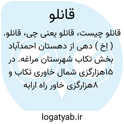 قانلو. ( اِخ ) دهی از دهستان احمدآباد بخش تکاب شهرستان مراغه. در 15هزارگزی شمال خاوری تکاب و 8هزارگزی خاور راه ارابه رو تکاب به احمدآباد واقع است. کوهستانی و معتدل و سالم است. 292 تن سکنه دارد. آب آن از چشمه سارها و محصولات آن غلات و بادام و حبوبات و کرچک و شغل اهالی زراعت و گله داری و صنایع دستی آنان جاجیم بافی است.راه مالرو دارد. ( از فرهنگ جغرافیایی ایران ج 4 ).