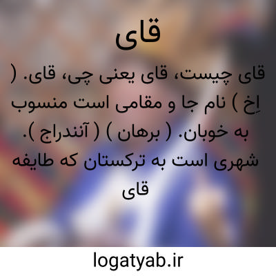 قای. ( اِخ ) نام جا و مقامی است منسوب به خوبان. ( برهان ) ( آنندراج ). شهری است به ترکستان که طایفه قای گوکلان در آن سکنی داشته اند. ( ترجمه مازندران واسترآباد رابینو ). || نام طایفه ای از مغول که به خوبروئی معروف بوده اند بنابر روایت ترکمن ها گوکلان ها در موقع حمله مغول قای نامیده میشدند که مشتق از نام قای خان پسر گون خان پسر اغزخان پسر قراخان اولین خان مشرق است. ( ترجمه مازندران و استرآباد رابینو ص 138 ):