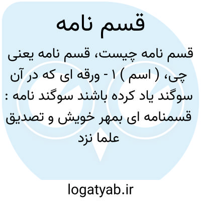 ( اسم ) ۱ - ورقه ای که در آن سوگند یاد کرده باشند سوگند نامه: قسمنامه ای بمهر خویش و تصدیق علما نزد شاه فرستادند ۲ - شعری که در آن سوگند یاد کرده باشند سوگند نامه.
