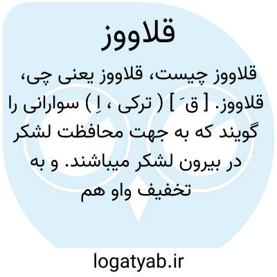 قلاووز. [ ق َ ] ( ترکی، اِ ) سوارانی را گویند که به جهت محافظت لشکر در بیرون لشکر میباشند. و به تخفیف واو هم آمده که بر وزن تجاوز باشد. و با رای بی نقطه هم گفته اند، و گویند ترکی است. ( برهان ). = قلاوز = قلوز= قلووز = قلابوز ( ترکی به کسر قاف ). مقدمه لشکر و راهبر. ( کاشغری ج 1 ص 403 و 404 ) ( رشیدی ):