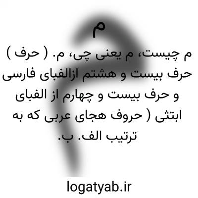 م. ( حرف ) حرف بیست و هشتم ازالفبای فارسی و حرف بیست و چهارم از الفبای ابتثی ( حروف هجای عربی که به ترتیب الف. ب. ت. ث آید، مقابل ابجدی ) و حرف سیزدهم از الفبای ابجدی است و در حساب جمل آن را به چهل دارند و آنرا میم گویند و بدینسان نویسند: «م « »مَ» «َمَ« »َم » مانند: آدم، مملکت و کم. این حرف مرفوع و از حروف یرملون است. و نیز یکی از هفت حرف آتشی است و آن هفت عبارتند از: الف و های هوز و طای حطی و میم و فای سعفص و شین قرشت و ذال.