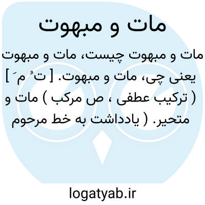 مات و مبهوت. [ ت ُ م َ ] ( ترکیب عطفی، ص مرکب ) مات و متحیر. ( یادداشت به خط مرحوم دهخدا ). حیران. سرگردان. سرگشته و سراسیمه. رجوع به مات و نیز رجوع به مبهوت شود.