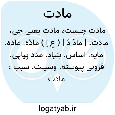مادت. [ مادْ دَ ] ( ع اِ ) مادّه. ماده. مایه. اساس. بنیاد. مدد پیاپی. فزونی پیوسته. وسیلت. سبب: مادت معیشت من آن بود که هر روز یگان دوگان ماهی می گرفتمی و بدان روزگار کرانه می کرد و مرا بدان سد رمقی حاصل می بود. ( کلیله و دمنه چ مینوی ص 83 ). چنانکه آب دریا را بمدد جویها مادت حاصل آید. ( کلیله ودمنه چ مینوی ص 197 ). چنانکه نور چراغ بمادت روغن و فروغ آتش بمدد هیزم. ( کلیله و دمنه چ مینوی ص 199 ).