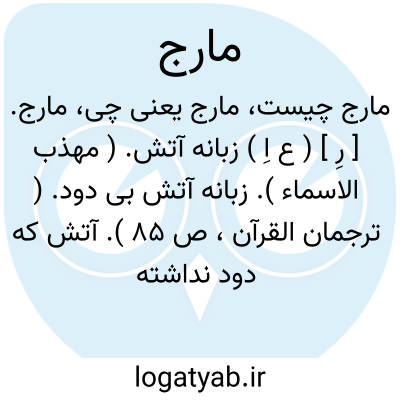 مارج. [ رِ ] ( ع اِ ) زبانه آتش. ( مهذب الاسماء ). زبانه آتش بی دود. ( ترجمان القرآن، ص 85 ). آتش که دود نداشته باشد. ( غیاث ). شعله بی دود. ( ناظم الاطباء ). شعله بی دود ساطعه سخت ملتهب. ( از اقرب الموارد ). آتش بی دود: مارج من نار. ( منتهی الارب ) ( دهار ). زبانه. لهب. شواظ. ( یادداشت به خط مرحوم دهخدا ): و خلق الجان من مارج من نار؛ یعنی از آتش بی دود. ( از اقرب الموارد ) ( از ناظم الاطباء ).