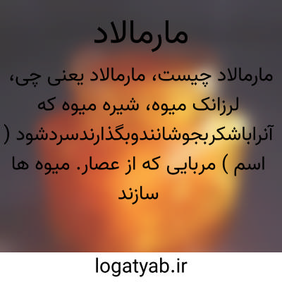 ( اسم ) مربایی که از عصار. میوه ها سازند. طرز تهی. آن غالبا همان طریق. تهی. شربت و مرباست. میوه هایی را که در مارمالاد مصرف میشود هم مانند مربا حل نشده باقی می گذارند و هم له کرده را بوسیل. الک صاف می کنند. اغلب مارمالادهای حل شده برای رنگ آمیزی روی نانهای مربایی مصرف میشود و آن انواع مختلف دارد مانند: مارمالاد آلبالو مارمالاد گیلاس مارمالاد توت فرنگی و غیره.