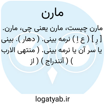 مارن. [ رِ ] ( ع اِ ) نرمه بینی. ( دهار ). بینی یا سر آن یا نرمه بینی. ( منتهی الارب ) ( آنندراج ) ( از ناظم الاطباء ). بینی و گویند کناره آن و گویند آن قسمت از بینی که نرم باشد و آن جزء استخوان بینی است. ج، موارن. ( از اقرب الموارد ). به معنی سربینی آن قدر که نرم باشد. ( غیاث ). قسمت نرم از بینی. ( یادداشت به خط مرحوم دهخدا ). || ( ص ) نیزه نرم. ( منتهی الارب ) ( آنندراج ) ( ناظم الاطباء ) ( از اقرب الموارد ).