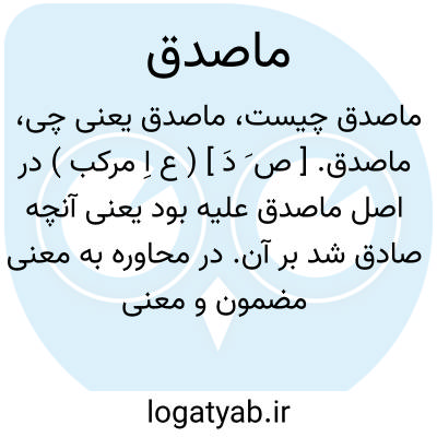 ماصدق. [ ص َ دَ ] ( ع اِ مرکب ) در اصل ماصدق علیه بود یعنی آنچه صادق شد بر آن. در محاوره به معنی مضمون و معنی مستعمل. ( غیاث ) ( آنندراج ). کلمه فعل مأخوذ از تازی، هرچیزی که بیان شود و ثابت و محقق گردد و در محاورات بیشتر به معنی مضمون و معنی استعمال می شود. ( ناظم الاطباء ). و رجوع به «ما» معنی دوم شود.