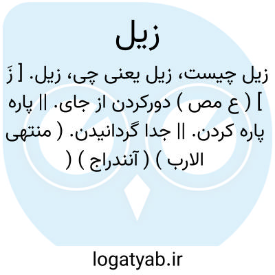 زیل. [ زَ ] ( ع مص ) دورکردن از جای. || پاره پاره کردن. || جدا گردانیدن. ( منتهی الارب ) ( آنندراج ) ( ناظم الاطباء ). جدا کردن. ( دهار ) ( از تاج المصادر بیهقی ). || جای فراتر کردن. ( تاج المصادر بیهقی ). ممتاز نمودن. ( منتهی الارب ) ( آنندراج ) ( ناظم الاطباء ).