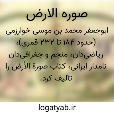 ابوجعفر محمد بن موسی خوارزمی (حدود ۱۸۴ تا ۲۳۲ قمری)، ریاضی‌دان، منجم و جغرافی‌دان نامدار ایرانی، کتاب صورة الأرض را تألیف کرد. این اثر، شرح و توصیفی از شهرهای بزرگ جهان اسلام و ویژگی‌های جغرافیایی سرزمین‌های مختلف به‌دست می‌دهد و در مواردی با نوشته‌های بطلمیوس مطابقت دارد. با این حال، خوارزمی برخی خطاهای بطلمیوس، از جمله در مورد طول دریای مدیترانه، را تصحیح کرد. منبع اصلی مؤلف، احتمالاً نقشه‌هایی بود که گروهی از دانشمندان برای مأمون خلیفه عباسی تهیه کرده بودند و خود خوارزمی نیز در میان آنان حضور داشت. این کتاب با تصحیح و حاشیه‌نویسی در لایپزیگ (۱۹۲۶ میلادی) و نیز با مطالعات علمی دقیق در رم (۱۹۴۴ میلادی) منتشر شده است.