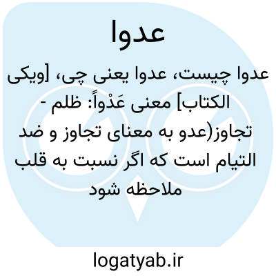 تجاوز. راغب گفته: عدو بمعنی تجاوز و منافات التیام است، آن گاهی با قلب است که به آن عدوات و معاداة گویند و گاهی در راه رفتن است که عَدْو (دویدن) نام دارد و گاهی در عدم رعایت عدالت در معامله است که عُدْوان و عدو گویند.... به آنها گفتیم در شنبه تجاوز نکنید و با صید در آن روز از دستور خدا سرباز نزنید.. عدو در دو آیه ذیل بمعنی تجاوز است،. ظاهراً «بَغیاً» مطلق طلب است یعنی: فرعون و لشکریانش در طلب آنان از روی تجاوز بدنبالشان رفتند. عدّو: دشمن. که در قلب به انسان عداوت دارد و در ظاهر مطابق آن رفتار میکند،. بقول راغب دشمن دو جور است یکی آن که بشخص عداوت دارد و بقصد دشمنی است مثل:. دیگری آن که بقصد عداوت نیست بلکه وی حالتی دارد که شخص از آن متّأذی میشود چنانکه از کار دشمن، مثل. بتهای بیجان نسبت به ابراهیم «علیه السلام» عداوتی نداشتند واز جماد عداوت متصّور نیست بلکه آنها جنبه معبودی داشتند و آن حالت ابراهیم را ناراحت میکرد لذا فرمود: آنها دشمن منند در مجمع در معنی آیه فرماید: پرستشگران اصنام و اصنام دشمن منند ولی عقلا را تغلیب کرده. ولی ظاهراً مرجع ضمیر اصنام است و ارجاع ضمیر اولوالعقل در قرآن در اینگونه موارد بسیار است. ظاهراً در آیه. نیز عدّو به همان معنی است یعنی همانطور که از دشمن صدمه به انسان میرسد ممکن است آنها نیز شما را به صدمه بیاندازند و میل و عشق به آنها از کار خدائی بازتان دارد. در اینجا لازم است به چند آیه نظر افکنیم: 1- *. این آیه درباره انتقام، قاعده کلّی است و روشن میکند که هر تجاوز را میتوان مقابله به مثل کرد و جمله «وَ اتَّقُوا اللهَ» بیان آنست که در مقابله به مثل نمیشود طغیان و تجاوز کرد بلکه باید در آن کمیّت و کیفیّت تجاوز طرف را مراعات نمود، با آنکه خداوند عدوان را دوست ندارد. ولی عدوان در مقابل عدوان از آن خارج است و عدوان اولیه ناپسند است اما این عدوان شخص را از ذلّت و خواری نجات میدهد. بلی گذشت و عفو هم در صورت قدرت مرضّی خداست و حسّ انتقام و جنبه رحمت هر دو در نظر است چنان که فرموده:. 2- *. شاید مراد ار دشمنی خدا آن باشد که رحمت خدا به آنها نمیرسد. 3- *. یعنی: قسم به دوندگان که نفس نفس زنند. و آتش افروزان که با زدن، آتش افروزند. و هجوم بران در وقت صبح، که با آن هجوم و دویدن غبار بلند کردند و بدان وسیله در میان قومی قرار گرفتند، که انسان به پروردگار خویش ناسپاس است. در مجمع فرموده: گویند این سوره درباره علی «علیه السلام» نازل گشته که رسول خدا «صلی اللّه علیه و آله و سلم» دفعاتی بعضی از صحابه را به جنگ ذاتالسلاسل فرستاد بینتیجه برگشتند تا علی «علیه السلام» را مأمور کرد او بر کفّار غالب شد، این از امام صادق «علیه السلام» در حدیث مفصّلی وارد شده است فرمود: این جنگ را ذاتالسلاسل گفتند که آن حضرت عدهّای از کفّار را کشت و اسیران را به ریسمان بست گوئی در زنجیرهااند. چون سوره نازل شد رسول خدا «صلی اللّه علیه و آله و سلم» در نماز صبح آن را خواند پس از نماز اصحاب گفتند: ما این آیات را تا به حال نشنیدهایم فرمود: علی به دشمنان خدا پیروز شد جبرئیل این بشارت را بر من امشب داد بعد از چند روز علی «علیه السلام» با غنائم و اسیران به مدینه وارد شد. این مطلب در صافی و برهان نیز نقل شده، اهل سنت نیز آن را نقل کرده ولی از علی «علیه السلام» نام نبردهاند. از علی «علیه السلام» و غیره عادیات شتران جنگ و شتران حاجیان نیز نقل شده است. اگر مراد از عادیات اسبان جنگی باشد میشود گفت که: این آیات سرود جنگ و مارش نظامی است و سوگندها با مطلب آیات در زیر تناسب دارد واللّه العالم. 4- *. ظاهراً در این گونه موارد مراد از عداوت دشمنی ظاهری و از بغضاء عداوت و کینه قلبی است گرچه عداوت به معنی تجاوز قلبی است در اقرب الموارد گفته: عداوت به معنی خصومت و دوری است به قولی آن اخصّ از بغضاء است که هر عدّ و مبغض است و گاهی آنکه دشمن نیست مبغض است. 5- *. عدوان چنان که از راغب نقل شد و در المنار ذیل آیه فوق گفته عدم رعایت عدالت در رفتار و معامله با دیگران است لذا بهتر 
