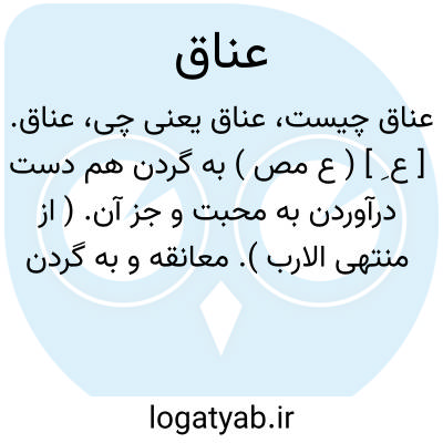 عناق. [ ع َ ] ( ع اِ ) بزغاله ماده. ( منتهی الارب ) ( آنندراج ) ( ناظم الاطباء ). ماده از بچه های بز پیش از رسیدن به یکسالگی. ( از اقرب الموارد ). و بعضی نوشته اند که از حین ولادت آن تا چهارماهگی. ( آنندراج ) ( غیاث اللغات ). بزبچه. ج، اَعنُق، عُنوق. ( از منتهی الارب ) ( آنندراج ) ( ناظم الاطباء ) ( از اقرب الموارد ). و صورت دوم جمع آن نادر است. ( از اقرب الموارد ). در مثل گویند: العنوق بعد النوق؛ یعنی چوپان بزغالگان شد، پس از آنکه ساربان ماده شتران بود، و این مثل را در مورد تنگ حالی پس از فراخ حالی آرند. ( از منتهی الارب ) ( از آنندراج ) ( از ناظم الاطباء ) ( از اقرب الموارد ). و نیز در مورد کسی گفته شود که از مقام بلند به مقام پست فرودآید. ( از اقرب الموارد ). || بلا و سختی. ( منتهی الارب ) ( آنندراج ) ( ناظم الاطباء ). || کار سخت. || نومیدی. || زکاة دوساله. ( منتهی الارب ) ( آنندراج ) ( ناظم الاطباء ) ( از اقرب الموارد ). || کلاغی است خردتر و باریکتر از کلاغ های دیگر با پاهای سرخ و منقاری به رنگ مرجان. و آن دانه خورد و گوشتش حلال باشد. ( از تذکره انطاکی ). || ( اِخ ) ستاره میانه ٔبنات نعش. ( منتهی الارب ) ( آنندراج ) ( از اقرب الموارد ). ستاره میانه بنات النعش کبری. ( ناظم الاطباء ).
