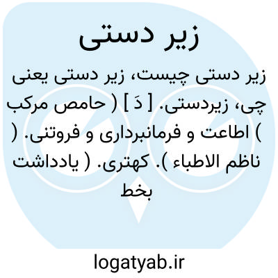 دگر شاه را زیردستی کند.نظامی.چه کنند اگر زبونی نکنند و زیردستی.سعدی.|| ( ص نسبی، اِ مرکب ) آنچه بزیر کاغذ نهند تا نوشتن آسان شود. زیرمشقی. ( یادداشت بخط مرحوم دهخدا ). || بشقاب که گذارند در سر سفره یا میز عصرانه و صبحانه تا فضول میوه و جز آن در آن ریزند. ( یادداشت بخط مرحوم دهخدا ). بشقابهای کوچک چینی یا فلزی یا پلاستیک که برای گذاشتن شیرینی و آجیل و نظایر آن مستعمل است و در سر سفره در آن سبزی خوردن و پنیر و دیگر مخلفات و خوراکیهای غیراساسی را می گذارند. ( فرهنگ عامیانه جمال زاده ).