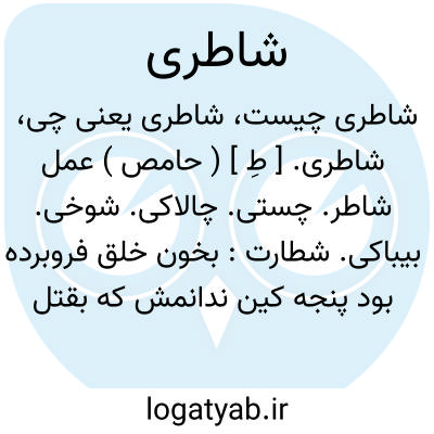 شاطری. [ طِ ] ( حامص ) عمل شاطر. چستی. چالاکی. شوخی. بیباکی. شطارت: