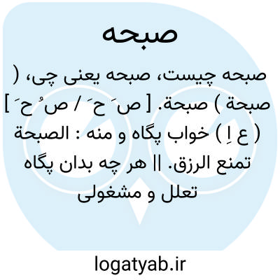 ( صبحة ) صبحة. [ ص َ ح َ / ص ُ ح َ ] ( ع اِ ) خواب پگاه و منه: الصبحة تمنع الرزق. || هر چه بدان پگاه تعلل و مشغولی کنند. || سیاهی مایل بسرخی. || سپیدی مایل بسیاهی. || سرخی مایل بسپیدی یا زردی. ( منتهی الارب ).