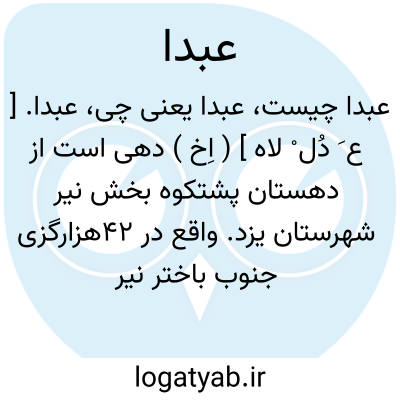عبدا. [ ع َ دُل ْ لاه ] ( اِخ ) دهی است از دهستان پشتکوه بخش نیر شهرستان یزد. واقع در 42هزارگزی جنوب باختر نیر و 33هزارگزی جنوب خاوری راه فرعی نیربه ابرقو. ناحیه ای است کوهستانی هوای آن معتدل است و 514 تن سکنه دارد. آب آن از قنات تأمین میشود. محصولاتش: غلات، ذرت، حبوبات، انجیر و بادام است. اهالی به کشاورزی اشتغال دارند و شغل زنان کرباس بافی است. راه مالرو دارد. ( از فرهنگ جغرافیائی ایران ج 10 ).