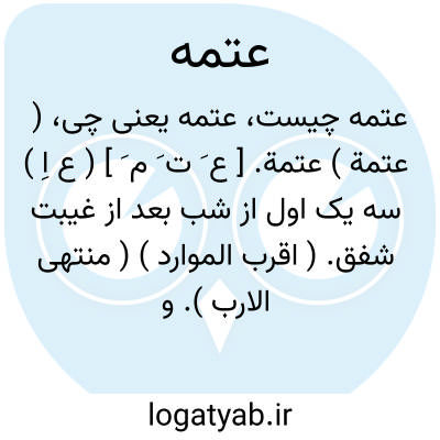 ( عتمة ) عتمة. [ ع َ ت َ م َ ] ( ع اِ ) سه یک اول از شب بعد از غیبت شفق. ( اقرب الموارد ) ( منتهی الارب ). و گفته شده است وقت نماز عشاء. ( اقرب الموارد ) ( منتهی الارب ). || باقی مانده شیر که بعد از دوشیدن فرودآرد به پستان یا شیر که وقت عتمه فراهم آرد. ( منتهی الارب ). بقیة اللبن یفیق بها النعم تلک الساعة. ( اقرب الموارد ). || تاریکی شب. ( اقرب الموارد ) ( منتهی الارب ). || ( مص ) بازگشتن شتران از چراگاه وقت شام. ( اقرب الموارد ) ( منتهی الارب ) ( آنندراج ).