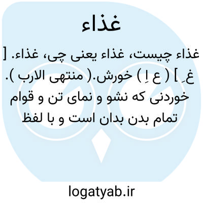 غذاء. [ غ ِ ] ( ع اِ ) خورش.( منتهی الارب ). خوردنی که نشو و نمای تن و قوام تمام بدن بدان است و با لفظ چیدن و کردن مستعمل. ( آنندراج ). خوراک و آشامیدنی که بدان اغتذاء شود. ج، اغذیه.( اقرب الموارد ). || پرورش که بدان بالیدگی و آراستگی جسم است. ( منتهی الارب ). هر آنچه نشو و نما و قوام تن بدان است. ج، اغذیه. ( اقرب الموارد ).