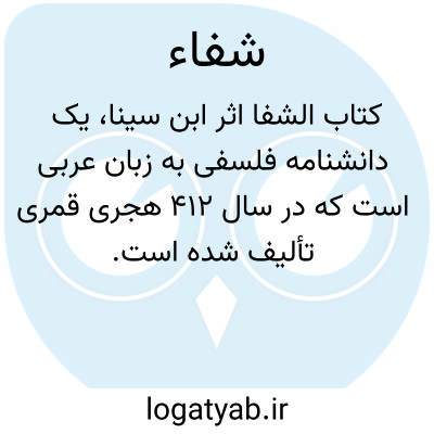 (یا: کتاب الشفاء) تألیف ابن سینا، کتابی به عربی، در حکمت و فلسفه، در ۴۱۲ق. این اثر کلان ترین اثر موجود در حکمت نظری و به ویژه منطق به شمار می رود و مشتمل است بر چهار کتاب: ۱. منطق، شامل نُه فن: مدخل، مقولات، باری ارمیناس (عبارت)، قیاس، برهان، جدل، سفسطه، خطابه، شعر. ۲. طبیعیات، شامل هشت فن: سماع طبیعی، سماء و عالم، کون و فساد، آثار علوی، علل اکوان، نفس، نبات، و طبایع حیوان. ۳. ریاضیات (تعلیمیات)، شامل چهار فن: هندسه، مجسطی (هیئت)، حساب، و موسیقی. ۴. الهیات، شامل ده مقاله: تعریف فلسفه و مباحث وجود؛ جوهر و اقسام آن؛ عرض و اقسام آن؛ حدوث و قدم و قوه و فعل؛ امور عامه، علل و غایات؛ وحدت و کثرت؛ شناسایی مبدأ اول؛ صدور کثرات از مبدأ اول؛ و بالاخره اشارۀ اجمالی به مبدأ و معاد، نبوت، پیدایش مدینه و امامت. مشهورترین جزء شفا همان الهیات است. شفا همواره مرجعی فلسفی بوده و بر آن بیش از ۸۰ شرح، حاشیه، تلخیص و ترجمه نگاشته اند. مشهورترین شروح بخش الهیات آن: کشف الخفاء علامه حلّی، عروةالوثقی علوی عاملی و شرح الهیات ملامهدی نراقی است، از تلخیص ها نیز می توان عون اخوان الصفاء علی فهم کتاب الشفا از بهاءالدین اصفهانی (فاضل هندی) و تلخیص منطق شمس الدین محمد خسروشاهی را نام برد. از مشهورترین حواشی بخش الهیات شفا: حواشی ملاصدرا، آقاحسین خوانساری، محمدباقر سبزواری؛ بر بخش طبیعیات: حواشی آقاجمال خوانساری و میرزا ابوالحسن جلوه؛ بر بخش منطق: حواشی و شروح میر سید احمد علوی. افزون بر گزارش های فوق، کتاب التحصیل بهمنیار، بیان الحق بضمان الصدق ابوالعباس لوکری و حتی المباحث المشرقیة فخر رازی بر پایۀ شفا به رشتۀ تحریر درآمده است. بخش هایی از شفا به زبان های لاتینی و آلمانی و انگلیسی ترجمه شده است. بخش سماع طبیعی آن را ذکاءالملک فروغی و قسمتی از بخش نفس را اکبر داناسرشت و بخش الهیات آن را سید احمد عریضی درب امامی به فارسی ترجمه کرده اند. قسمت طبیعیات و الهیات شفا در تهران ۱۳۰۵ق چاپ سنگی، و تمامی آن زیر نظر ابراهیم مدکور در قاهره، از ۱۹۵۲ به بعد، در چندین مجلد تصحیح و چاپ شده است.