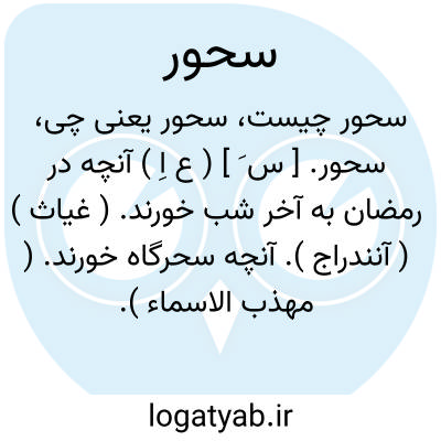 سحور. [ س َ ] ( ع اِ ) آنچه در رمضان به آخر شب خورند. ( غیاث ) ( آنندراج ). آنچه سحرگاه خورند. ( مهذب الاسماء ). آنچه روزه گیران بسحر خورند. آنچه سحرگاه خورند از طعام یا شراب. ( از اقرب الموارد ):