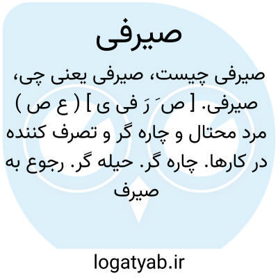 صیرفی. [ ص َ رَ فی ی ] ( ع ص ) مرد محتال و چاره گر و تصرف کننده در کارها. چاره گر. حیله گر. رجوع به صیرف شود. || سیم سره کننده. ج، صیارفه، صیاریف. ( منتهی الارب ). صراف. ( غیاث اللغات ) ( دهار ):