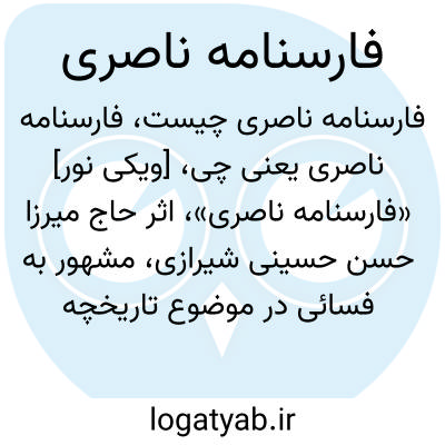 [ویکی فقه] فارسنامه ناصری (کتاب). «فارسنامه ناصری»، اثر حاج میرزا حسن حسینی شیرازی، مشهور به فسائی در موضوع تاریخچه و موقعیت جغرافیایی فارس به زبان فارسی منتشر شده است.