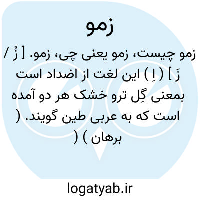 زمو. [ زُ / زَ ] ( اِ ) این لغت از اضداد است بمعنی گِل ترو خشک هر دو آمده است که به عربی طین گویند. ( برهان ) ( از ناظم الاطباء ) ( از شرفنامه منیری ) ( از فرهنگ جهانگیری ). در مؤید بمعنی گل تر و خشک آمده و در فرهنگ به این معنی به فتح زا آورده و گفته که این لغت از اضداد است. ( فرهنگ رشیدی ) ( انجمن آرا ) ( آنندراج ).