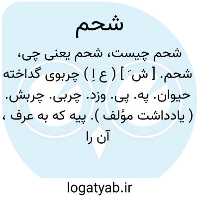 شحم. [ ش َ ] ( ع اِ ) چربوی گداخته حیوان. په. پی. وزد. چربی. چربش. ( یادداشت مؤلف ). پیه که به عرف، آن را چربی گویند. ( منتهی الارب ). آن قسمت سفید و سبک از گوشت حیوان مانند آنچه شکم و روده های آن را پوشاند. ج، شحوم. ( اقرب الموارد ):