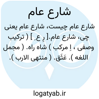 شارع عام.[ رِ ع ِ ] ( ترکیب وصفی، اِ مرکب ) شاه راه. ( مجمل اللغه ). عَثَق. ( منتهی الارب ). راه عمومی و کوچه ای که بن بست نباشد. ( ناظم الاطباء ). رهگذر همه: چه هر که بر عمیا در راه مجهول رود و از راه راست و شارع عام دور افتد بگمراهی نزدیک تر باشد. ( کلیله و دمنه ). مسکن ایشان نزد شارع عام بود. ( کلیله و دمنه ).