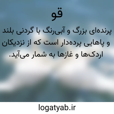 قو. ( اِ ) پرنده ای است از جنس مرغابی که گردن دراز و پرهای نرم و لطیف برنگ سیاه و سفید دارد و در آب شنا میکند. در نرمی و لطافت به پرهای آن مثال زنند. این پرنده را جویینه نیز گویند. ( ناظم الاطباء ).
