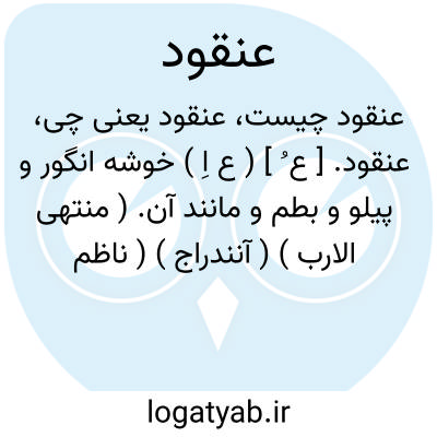 عنقود. [ ع ُ ] ( ع اِ ) خوشه انگور و پیلو و بطم و مانند آن. ( منتهی الارب ) ( آنندراج ) ( ناظم الاطباء ). آنچه از دانه انگور و یا اراک و یا بطم و از قبیل آنها، بر یک شاخه گرد آمده و متراکم باشند. ( از اقرب الموارد ). عِنقاد. رجوع به عنقاد شود. ج، عَناقید. ( اقرب الموارد ) ( منتهی الارب ). || علم است مر گاو نر را. ( منتهی الارب ). نام گاو نر. ( ناظم الاطباء ). || نباتی است پرشاخ و بقدر سه شبر. و برگش مثل سداب و زیره، و بی شکوفه. و خوشه او سرخ مملواز تخم. و در رایحه شبیه به سداب. سرد و خشک و مقوی اعضا و مانع ریختن مواد به اعضاء. و ضماد او رافع اورام حاره و التهاب آن، و مسکن حدت خون و صفرا است. و قدر شربت آن تا سه درهم. ( از تحفه حکیم مؤمن ).