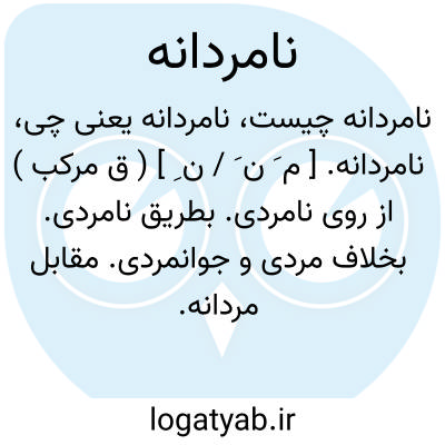 نامردانه. [ م َ ن َ / ن ِ ] ( ق مرکب ) از روی نامردی. بطریق نامردی. بخلاف مردی و جوانمردی. مقابل مردانه. || ( ص مرکب ) بی غیرت. ناکس. آنکه کاری را دلیرانه نکند. ( ناظم الاطباء ).