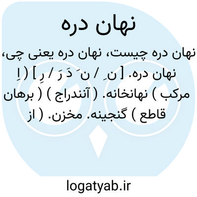 نهان دره. [ ن ِ / ن َ دَ رَ / رِ ] ( اِ مرکب ) نهانخانه. ( آنندراج ) ( برهان قاطع ) گنجینه. مخزن. ( از برهان ). نهندره. ( جهانگیری ) ( رشیدی ). رجوع به نهانخانه شود: