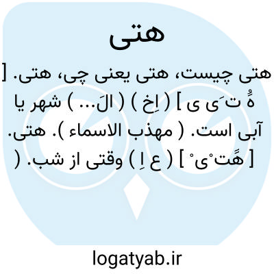 هتی. [ هََ تی ی ] ( ع اِ ) وقت. هنگام. ( اقرب الموارد ) ( تاج العروس ) ( منتهی الارب ). هزیع.بیشتر در شب و گاهی در مورد روز هم استعمال شود. ( معجم متن اللغة ). قسمتی از زمان. هَت ء. هِت ْءْ. هَتی ٔ.هِتاء. هیتْاءْ. هیتاء. هَتاءة. هُتاءَ. هِتَاءْ.