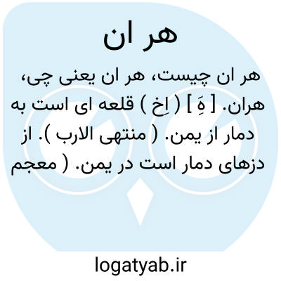 هران. [ هََ ] ( اِخ ) دهی است از دهستان خروسلو بخش گرمی شهرستان اردبیل که در 14 هزارگزی باختر گرمی و یکهزارگزی راه شوسه گرمی واقع و دارای 21 تن سکنه است. از چشمه ها و رودخانه درآورد مشروب میشود. محصول عمده اش غلات و کار مردم زراعت و گله داری است. ( از فرهنگ جغرافیایی ایران ج 4 ).