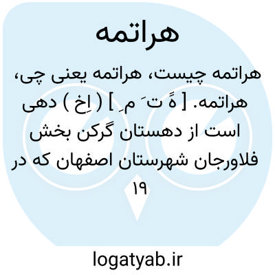 هراتمه. [ هََ ت َ م ِ ] ( اِخ ) دهی است از دهستان گرکن بخش فلاورجان شهرستان اصفهان که در 19 هزارگزی جنوب خاوری فلاورجان واقع است. جلگه معتدل و دارای 603 تن سکنه است. محصول عمده اش غله، برنج، صیفی و پنبه، و کار مردم زراعت، گله داری و کرباس بافی است. ( از فرهنگ جغرافیایی ایران ج 10 ).
